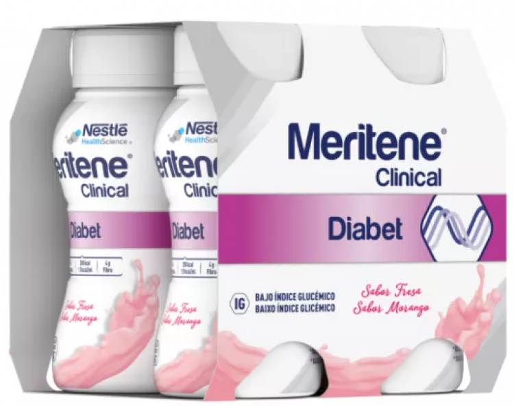 Suplemento nutricional oral completo, adaptado para pessoas com diabetes ou hiperglicemia, sabor morango, pronto a consumir em garrafas de 200 ml.