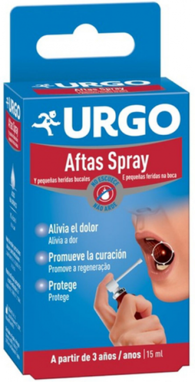 URGO Aftas Spray Lesões Bucais protege, hidrata e promove a regeneração da membrana mucosa da boca no caso de feridas e lesões. Também alivia a dor e promove a regeneração. Este produto não contém álcool ou açúcar e não arde.