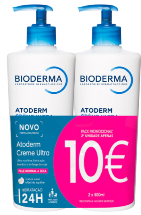 Este Pack Promocional inclui 2 unidades de 500 ml de Bioderma Atoderm Creme Ultra Hidratante, ideal para peles normais a secas. Ultranutritivo e emoliente, proporciona +27% de hidratação após 24 horas, com efeito imediato e duradouro.