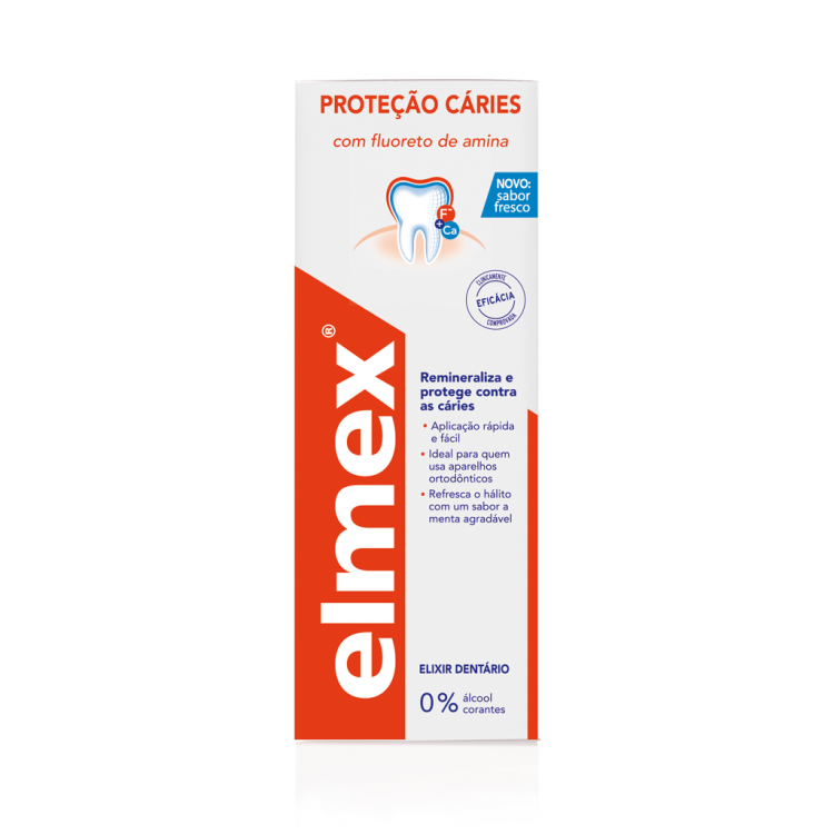 O elixir bucal Elmex Caries Protection Caries Protection não só refresca o hálito, como também combate a placa dentária e ajuda a manter os dentes e as gengivas saudáveis.