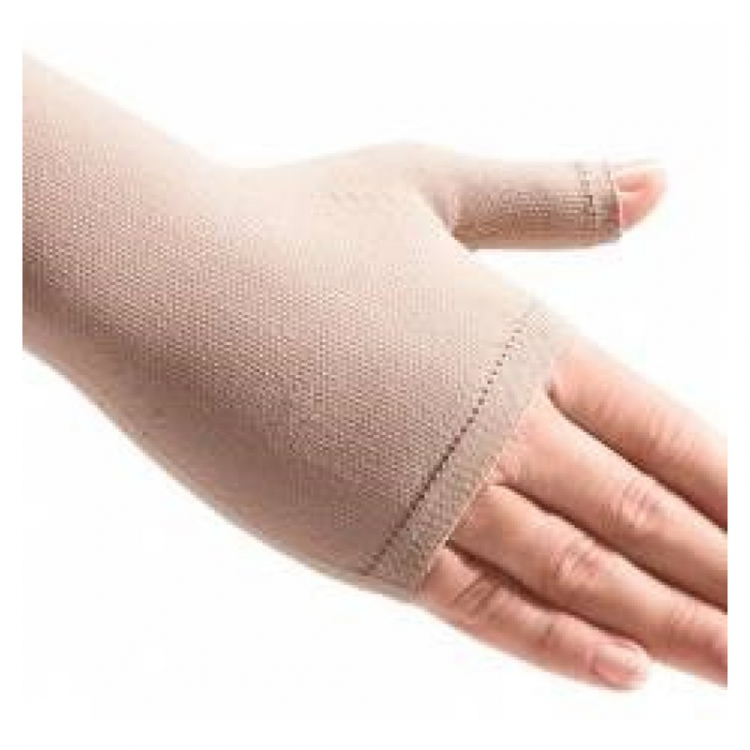 Luva elástica medicinal, com meio polegar e de compressão média (23-32 mmHg), ideal na prevenção de dores, em caso de agravamento de lesões durante a prática de desporto e no auxílio durante o tratamento de lesões na região do pulso e mão.