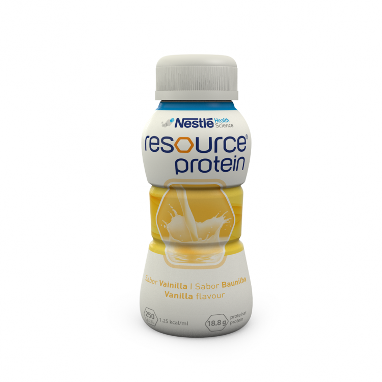 Resource Protein Baunilha é uma dieta oral completa hiperproteica em formato 200ml, para indivíduos com necessidades proteicas aumentadas e/ou patologias que levam à desnutrição. Concentração calórica 1.25 kcal/ml, 18,8 g de proteínas por garrafa, Clinicamente isento de lactose, Isento de glúten e Contém todas as vitaminas, minerais e oligoelementos necessários para uma alimentação completa.